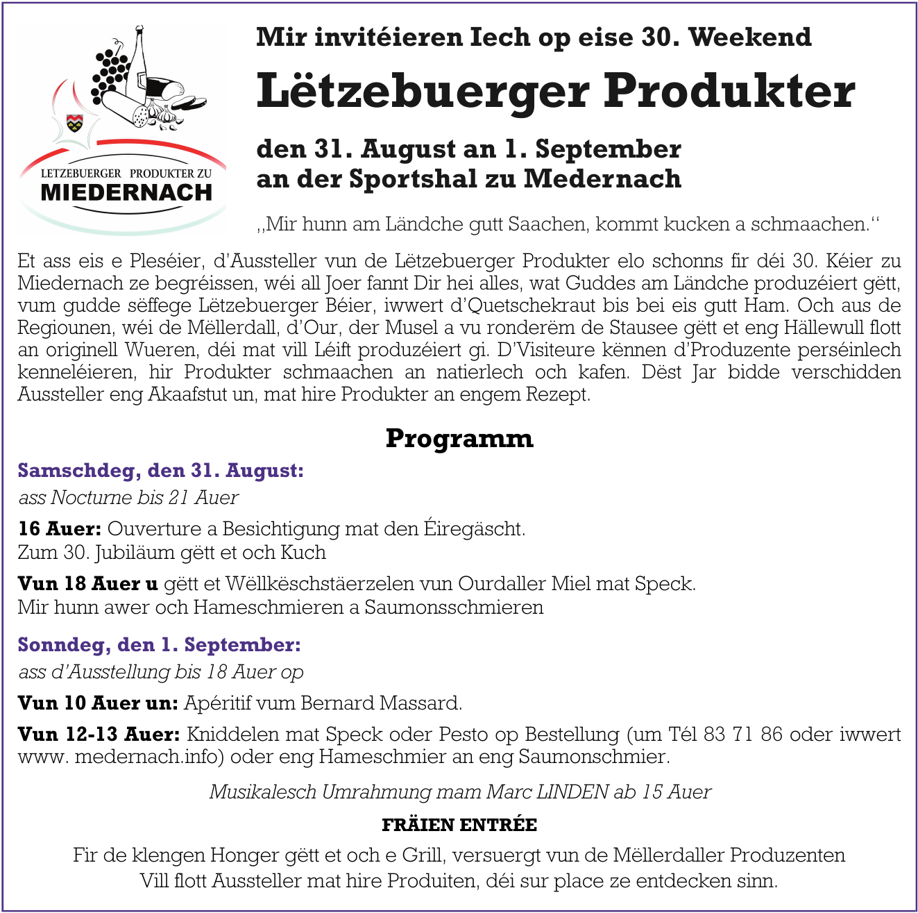 Am 31. August und 1. September 2019 veranstaltet der Syndicat d’Initiative et du Tourisme Aerenzdallgemeng a.s.b.l.“ seine landbekannte Ausstellung von luxemburgischen Produkten zum 30. Mal. Die Ausstellung wird genau wie üblich in der Sportshalle in Medernach abgehalten und hat nach wie vor als Hauptanliegen die Förderung von luxemburgischen Lebensmitteln und steht demnach unter dem Motto „Mir maachen gudd Saachen am Ländchen – Lëtzebuerger Iessen an Drënken“.