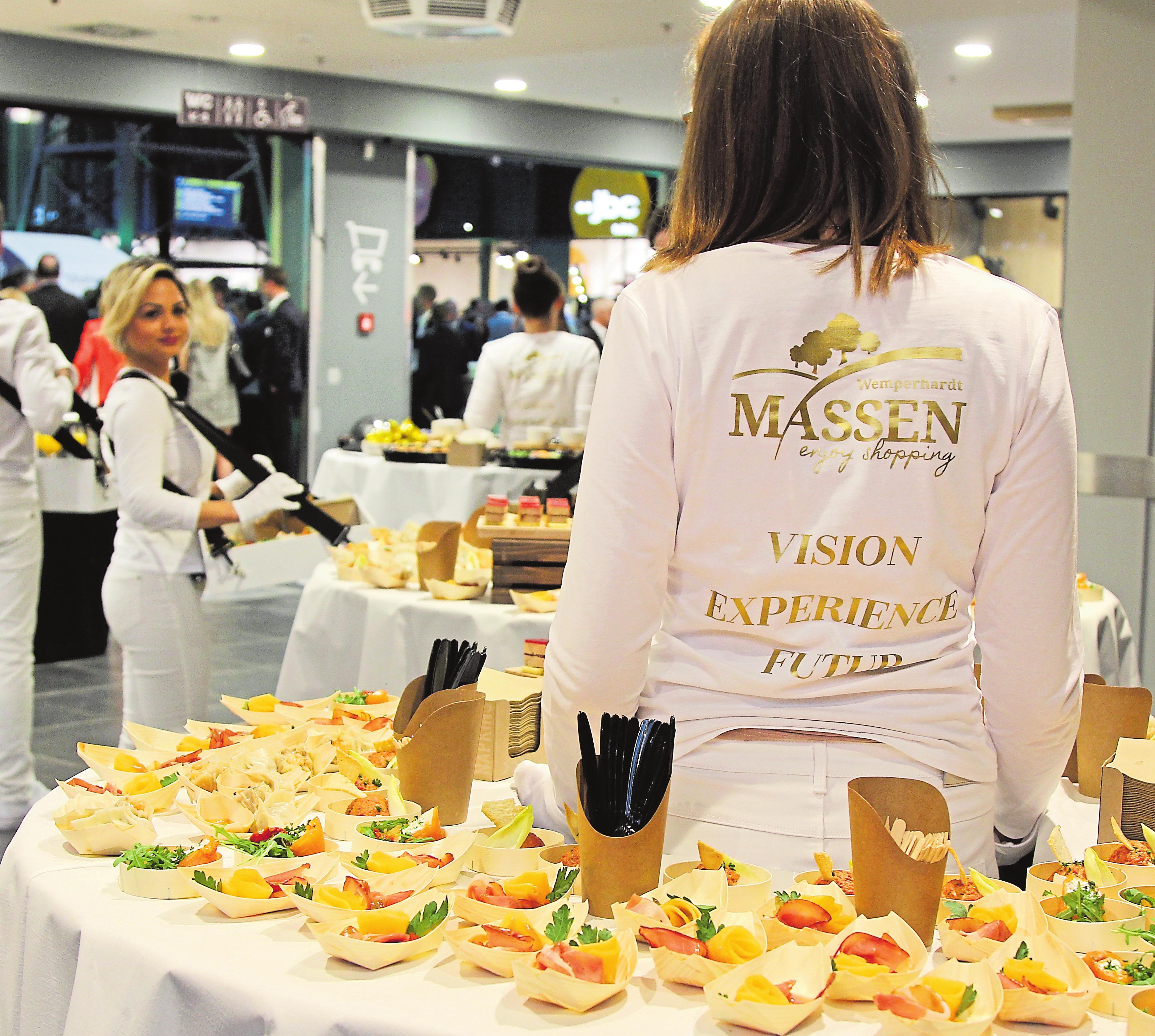Die Gäste wurden rundum durch die Massen-Gastronomie mit leckerem Fingerfood, das spektakulär auf Bauchläden und wandernden Tischen serviert wurde, verwöhnt. Auch gab es tolle Getränkestände sowie Champagnergirls. Außerdem konnten die Gäste sich vom Gesamtangebot ein Bild schaffen, da ihnen geführte Besichtigungen durch die Galerie Massen sowie durch den Supermarkt La Grande Épicerie Massen geboten wurden. Auch dort gab es diverse Verkostungsstände mit hausgemachten Spezialitäten, eine Kompetenz, für die das Haus Massen weiträumig bekannt ist.