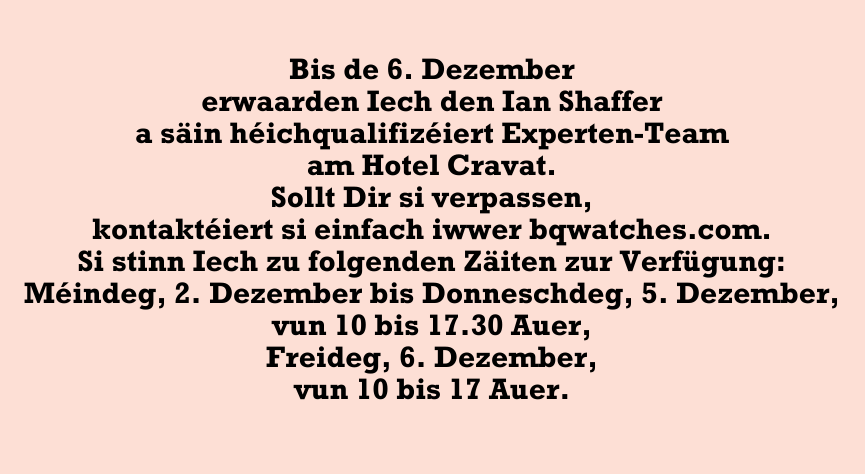 Den Ian Shaffer vu BQ Watches mat Sëtz zu London steet zu Lëtzebuerg zur Verfügung, fir Expertisë vu Luxusaueren, ë. a. grouss Marke wéi Rolex a Cartier, an och vu Gold, Diamanten a Bijouen (egal a wéi engem Zoustand) unzebidden.