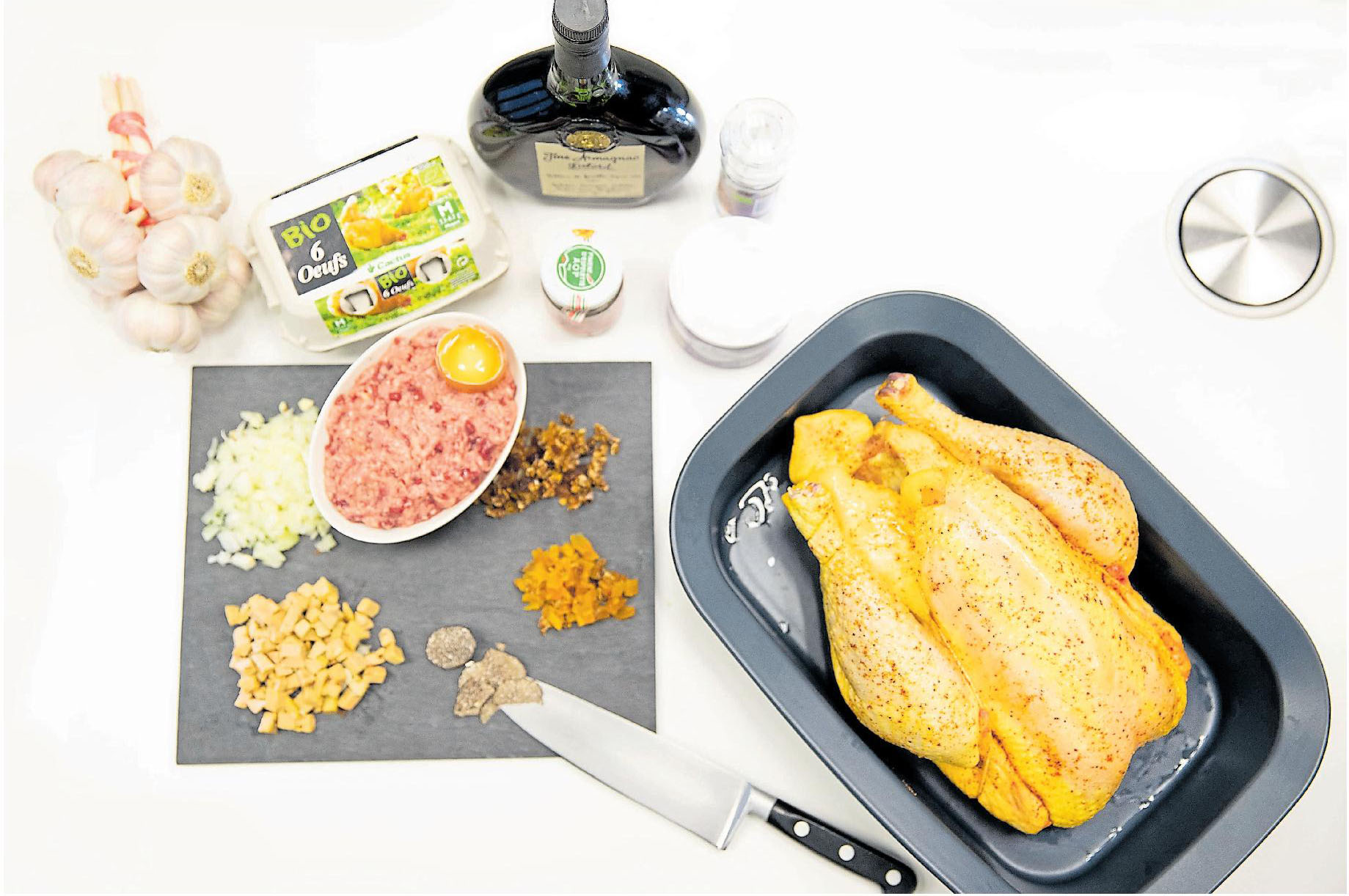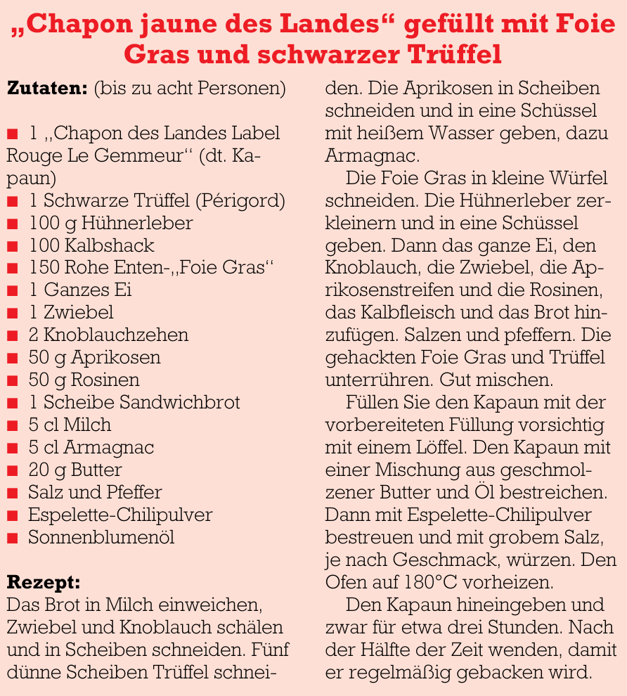 Die Tiere werden in Freiheit in Pinienwäldern gezüchtet, sind also nicht eingezäunt, haben jedoch einen beheizten Verschlag als Unterschlupf, Marensine genannt. In diesen finden die Tiere auch Essen in Form von Mais vor, wodurch das Fleisch gelblich sowie noch etwas aromatischer wird. „Außerdem enthält die Ernährung der Kapphähne die letzten 25 Tage ihrer Aufzucht zehn Prozent Milch, wodurch sich im Fleisch feine Fettablagerungen bilden, die wiederum dafür sorgen, dass der Braten im Ofen nicht trocken wird“, erklärt der Metzgermeister. Der Braten kann je nach Vorliebe mit verschiedenen Zutaten gefüllt werden. Die von De Mesmaeker vorgeschlagene Füllung besteht unter anderem aus Kalbshack, Foie Gras, Trüffel und Aprikosen. Damit der Braten durchgegart ist sowie eine schöne Kruste hat, dabei jedoch nicht trocken wird, sollte dieser im Ofen für drei Stunden bei etwa 160 Grad gehen – ganzes Rezept im Kasten unten. Als Beilage eigenen sich laut dem Metzgermeister unter anderem Ofenkartoffeln oder auch angeschwitztes Paprikagemüse.
