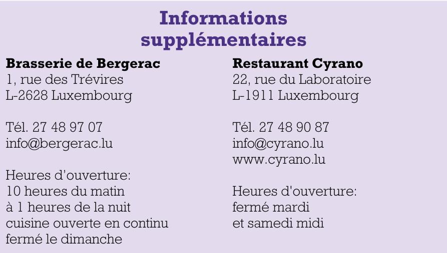 Dans la carte à vins on retrouve comme origines les régions reflétant la cuisine au programme du Cyrano: de la Bourgogne en passant par les Côte du Rhône vers le Piémont et les Pouilles. Côté luxembourgeois ce sont surtout les vins des caves Gales qui sautent aux yeux. A midi, le Restaurant Cyrano offre son plat du jour alors que chez son voisin d’en face, à la Brasserie de Bergerac c’est la suggestion du jour qui attend les clients.