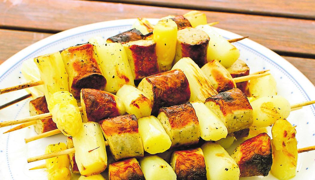 6. Und ab geht's auf den Grill. Wenn die Wurst schön braun und knusprig ist, sind die Spieße fertig.
