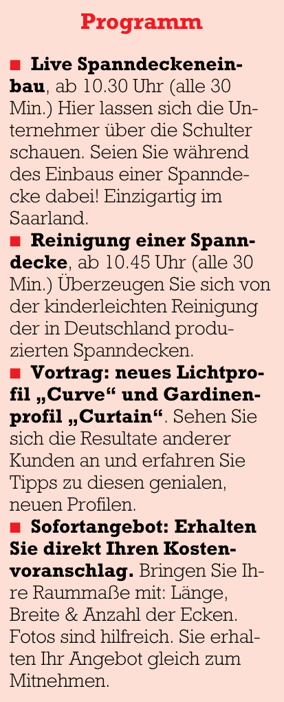 Der Spanndeckenspezialist Schindera lockt mit einem vollen Programm