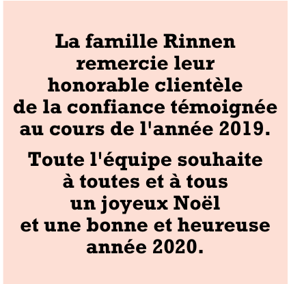 Depuis de nombreuses années, cette action fait partie d'une initiative de remplacer les cadeaux de fin d'année par un don à une association caritative. Congé de fin d'année du 21 décembre 2019 au 12 janvier 2020.
