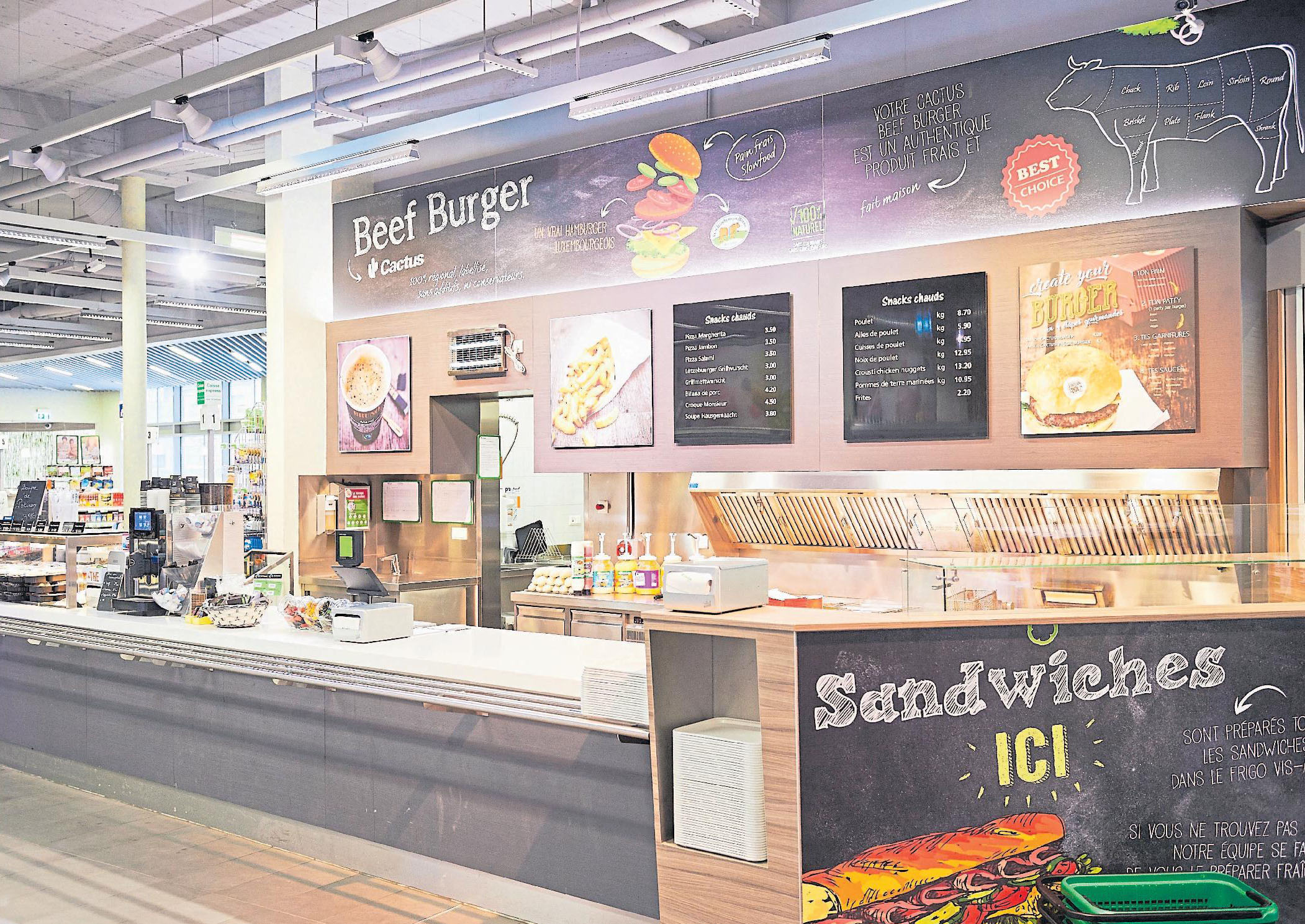Zum Angebot und Konzept des Cactus-Convenience Food gehören auch Verkaufspunkte in mehreren Filialen, die unter anderem frisch zubereitete Burger, Pizzen oder auch Hähnchen verkaufen. Im Cactus Marché Bonneweg können Kunden sogar ihren Burger ganz nach ihren Vorstellungen zusammenstellen.