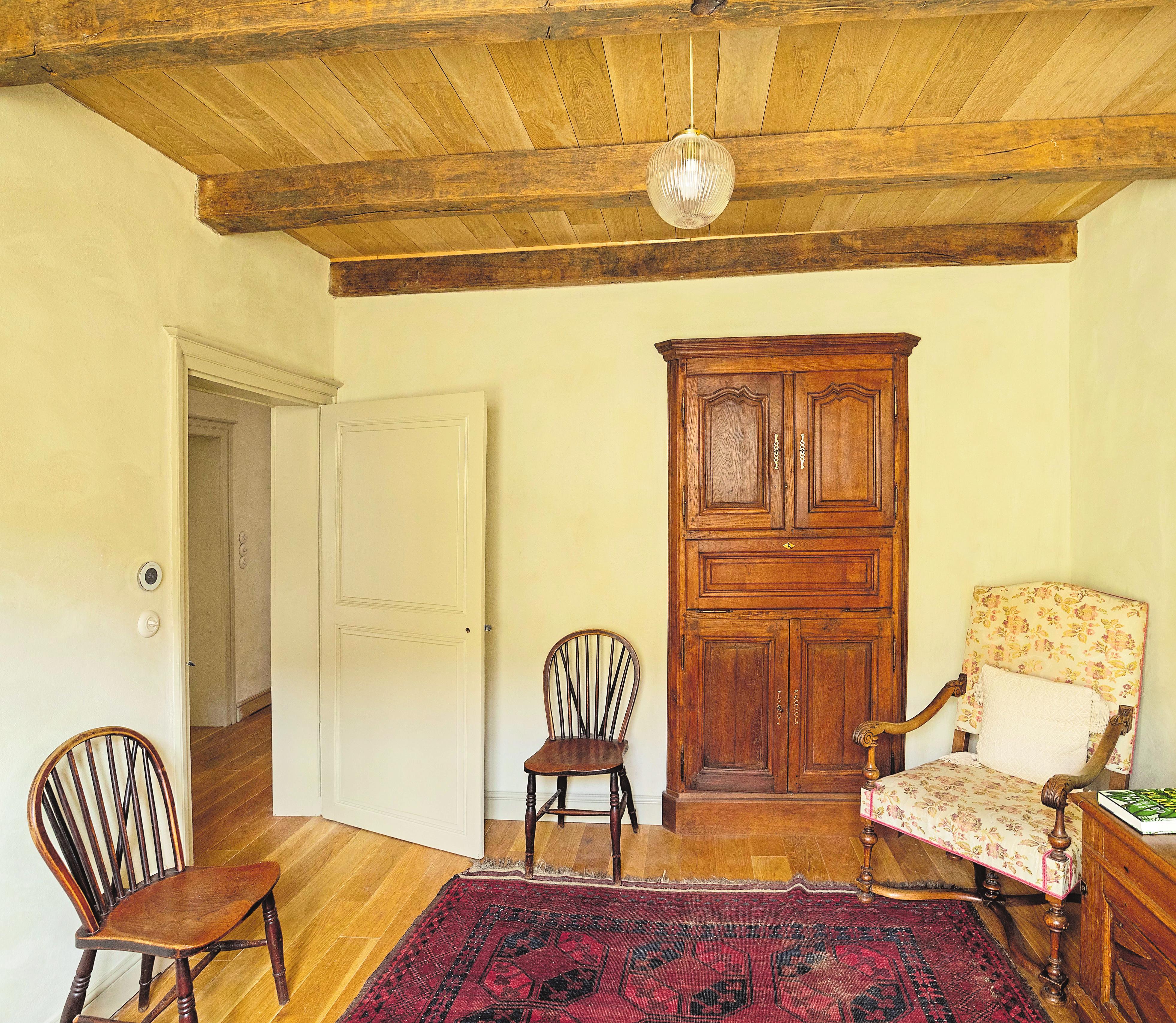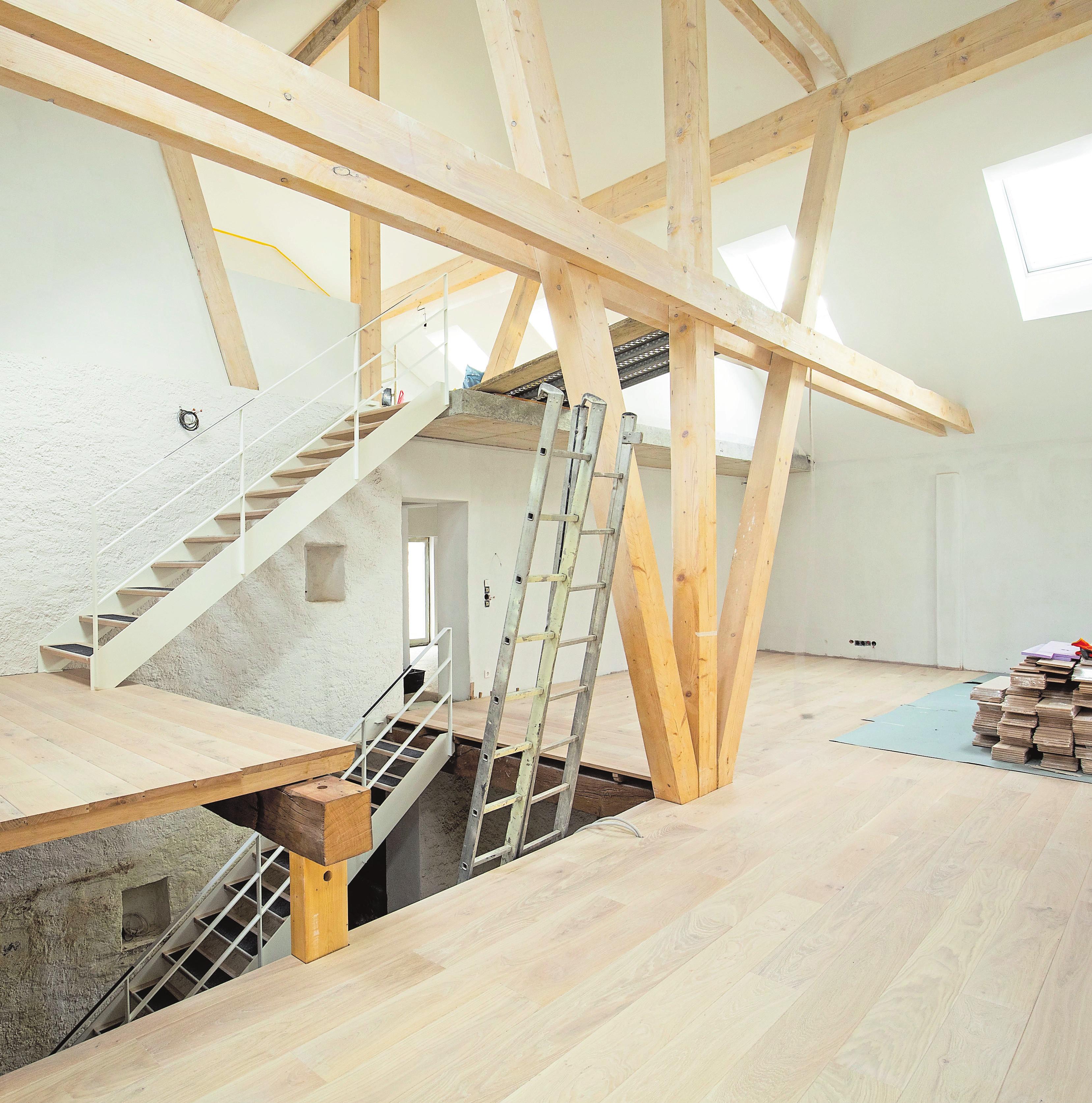 Neben den heimeligen Wohnräumen freuen sich die Besitzer besonders über die großen Innenräume der Scheune, die sie in ihren Dimensionen und ihrer Einfachheit erhielten. Nur einige wenige, dezent bemessene Öffnungen wurden zur Lichtoptimierung und Sicht auf Dorf und Weinberge in die Fassaden hinzugefügt. Auch ein paar markante, aber schlichte Elemente, wie die zwei neuen Stahltreppen, wurden neben dem vom Vorgänger inspirierten, neuen Dachstuhl, integriert. Das Resultat ist ein großzügiger Wohnraum, der in seinen alten Mauern viel Platz für historische und moderne Möbel sowie Kunst zu bieten hat.